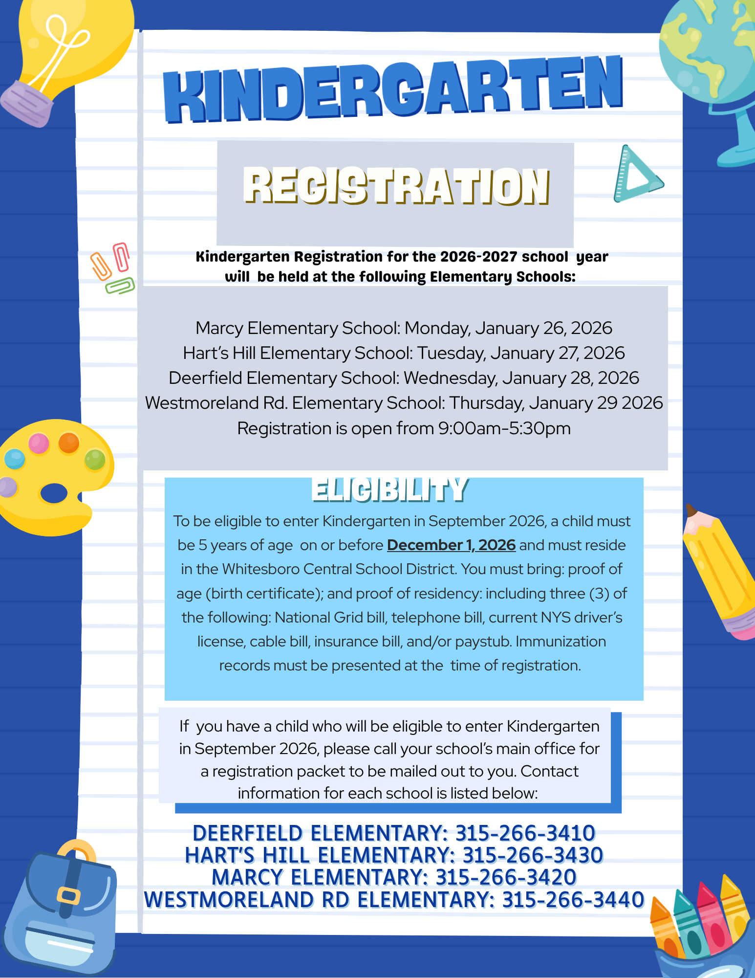 ** To be eligible to enter kindergarten in September 2026, a child must be 5 years of age on or before December 1, 2026 and must reside in the Whitesboro Central School District. You must bring: proof of age (birth certificate); and proof of residency: including three (3) of the following: National Grid bill, telephone bill, current NYS driver's license, oil/propane delivery bill, cable bill, insurance bill, and/or paystub. Immunization records must be presented at the time of registration. **